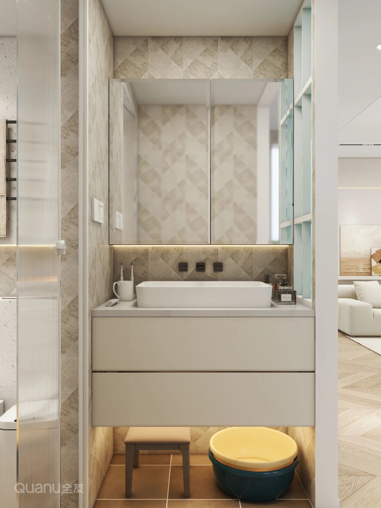 選用(yong)防霧鏡櫃,內(nei)部(bu)采用(yong)分(fēn)層設(shè)計(ji)。高(gao)處存放備(bei)用(yong)物(wù)品(pin),中(zhong)層放置日(ri)常護膚品(pin),底層安(an)排(pai)每日(ri)必用(yong)品(pin)。另外建(jian)議在(zai)牆面預留插座,方(fang)便電(dian)器(qi)充電(dian)。