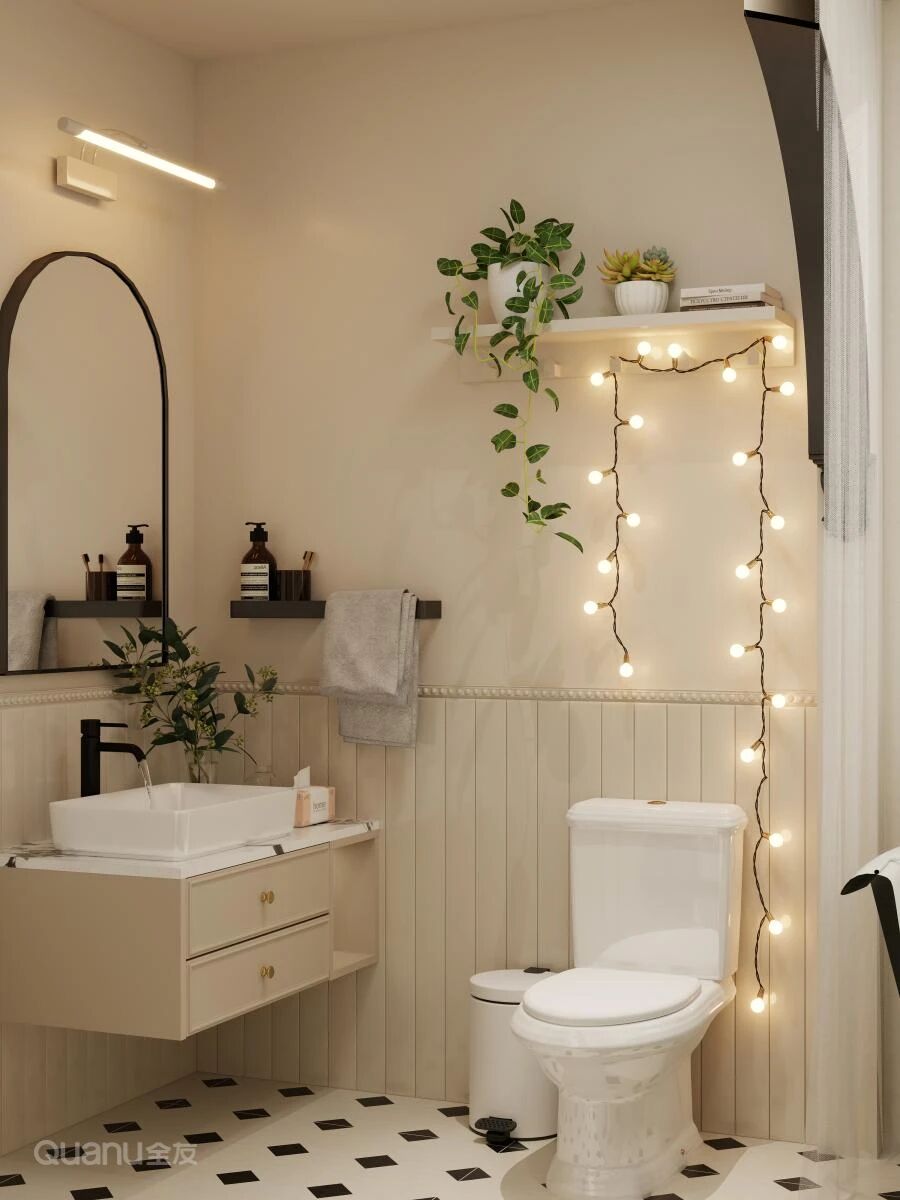 在(zai)馬桶上方(fang)安(an)裝(zhuang)壁挂薄櫃,深度約20cm,分(fēn)層收納紙巾咊(he)洗護用(yong)品(pin),輕松利用(yong)垂直空間的(de)同時,又(yòu)能(néng)保持地面整潔。