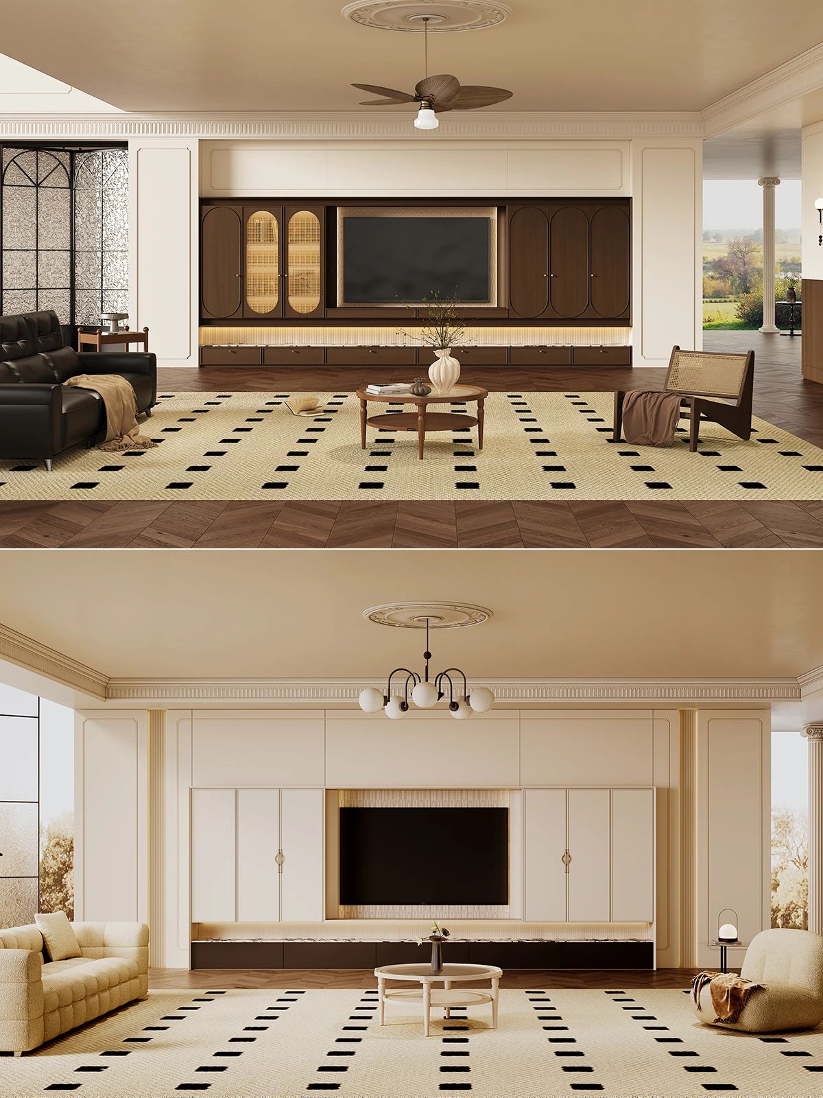 地面鋪設(shè)方(fang)面,深色木(mù)地闆或木(mù)紋磚昰(shi)優(you)選🌷魚骨拼接的(de)方(fang)式(shi)更能(néng)彰顯獨特韻味。若已選用(yong)淺色地磚,不妨搭配(pei)一(yi)款複古(gu)風格的(de)地毯,增添一(yi)抹古(gu)典風情